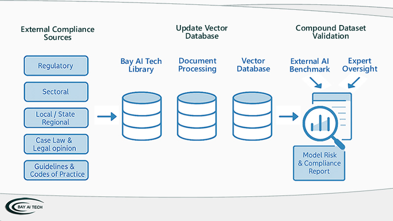 Bay AI Tech specialise in producing turnkey compliance systems focused on providing local AI computer resource under the control of the compliance department. To achieve this we have a curated dataset for each regulatory sector e.g., privacy, a process to validate the proprietary inhouse datasets, custom RAG system designed for ease of update and reliability.